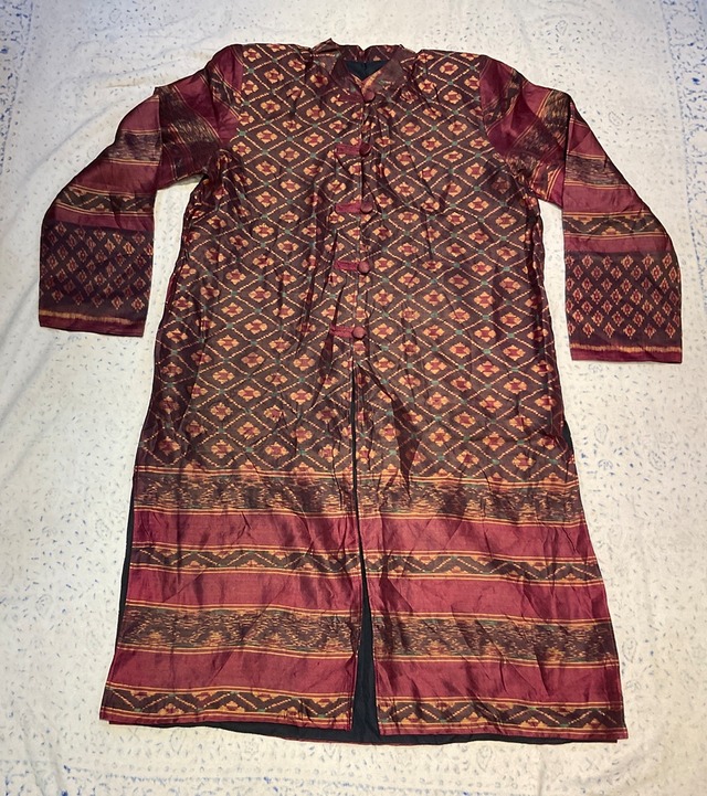 身幅 52cm 着丈 73cm カシミール手刺繍 カシミールの手刺繍としても特別な感じの刺繍としっかり目のシルク生地でゴージャスな作品です。 他のシルクのジャケットと比べるとややどっしりした感じです。