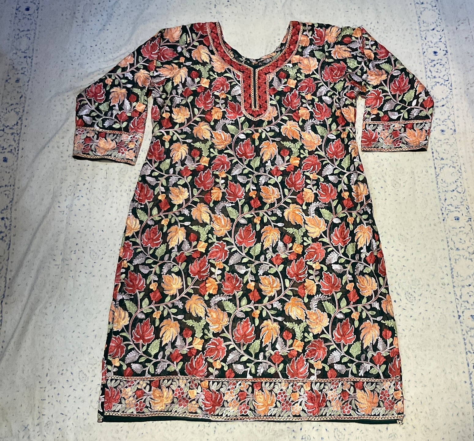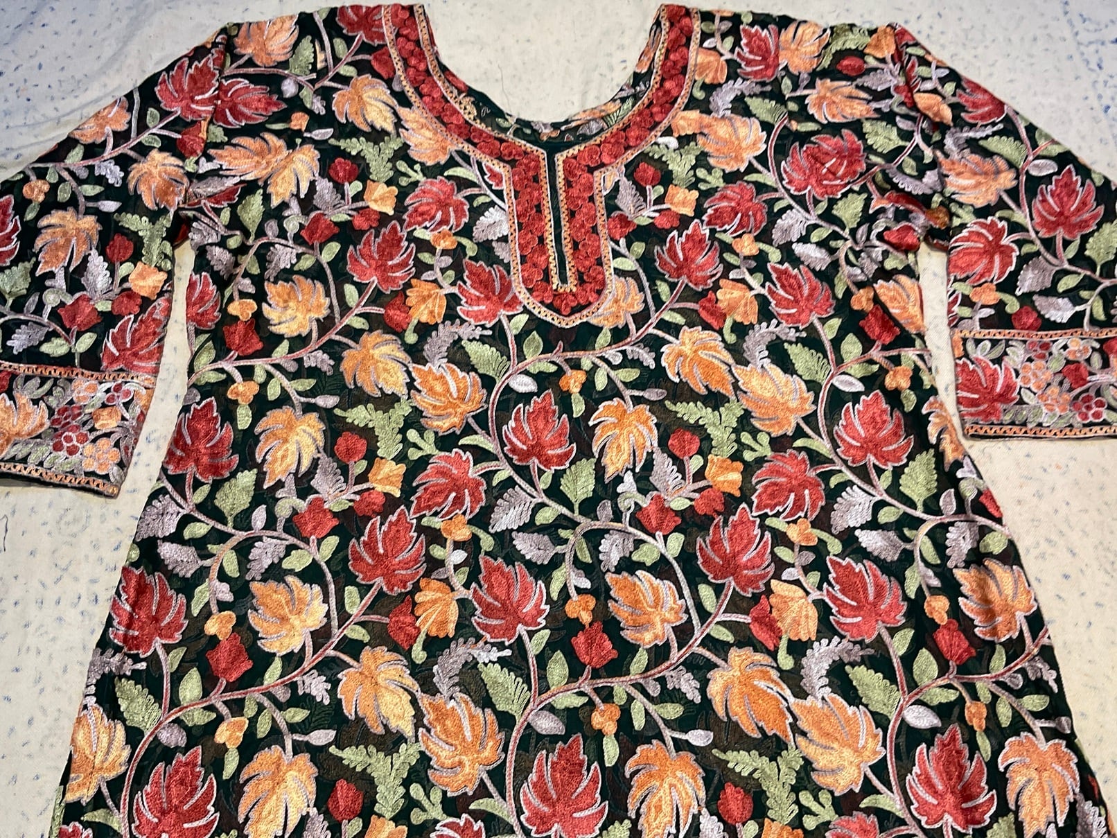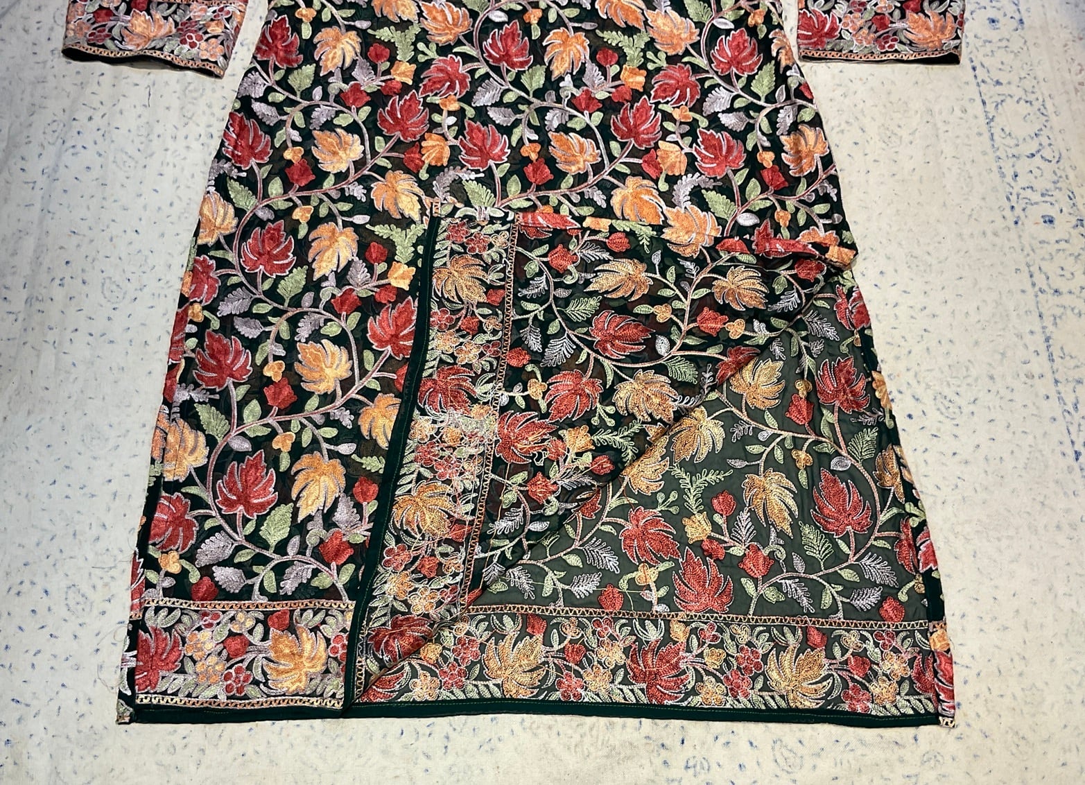 シルクの薄手の生地にカシミールの美しい手刺繍が隙間なく施されている華やかな作品です。