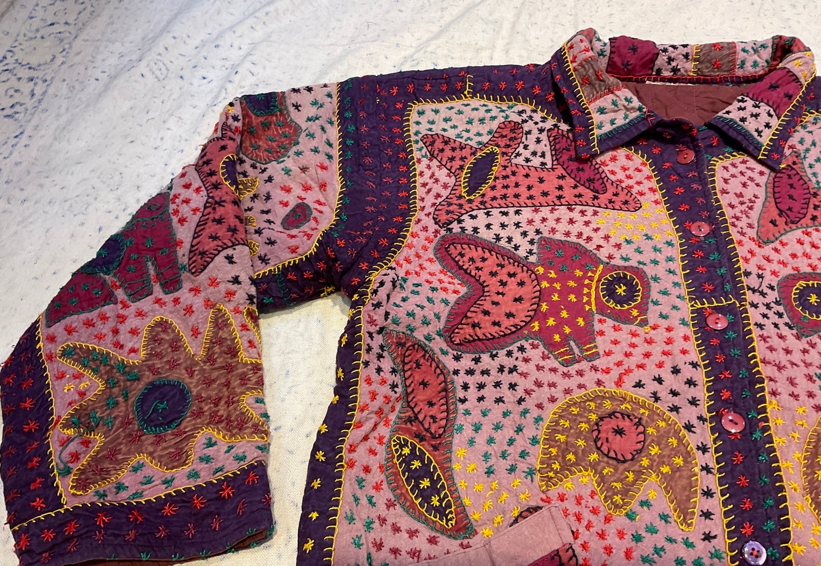 とても個性的なアップリケと手刺繍です。