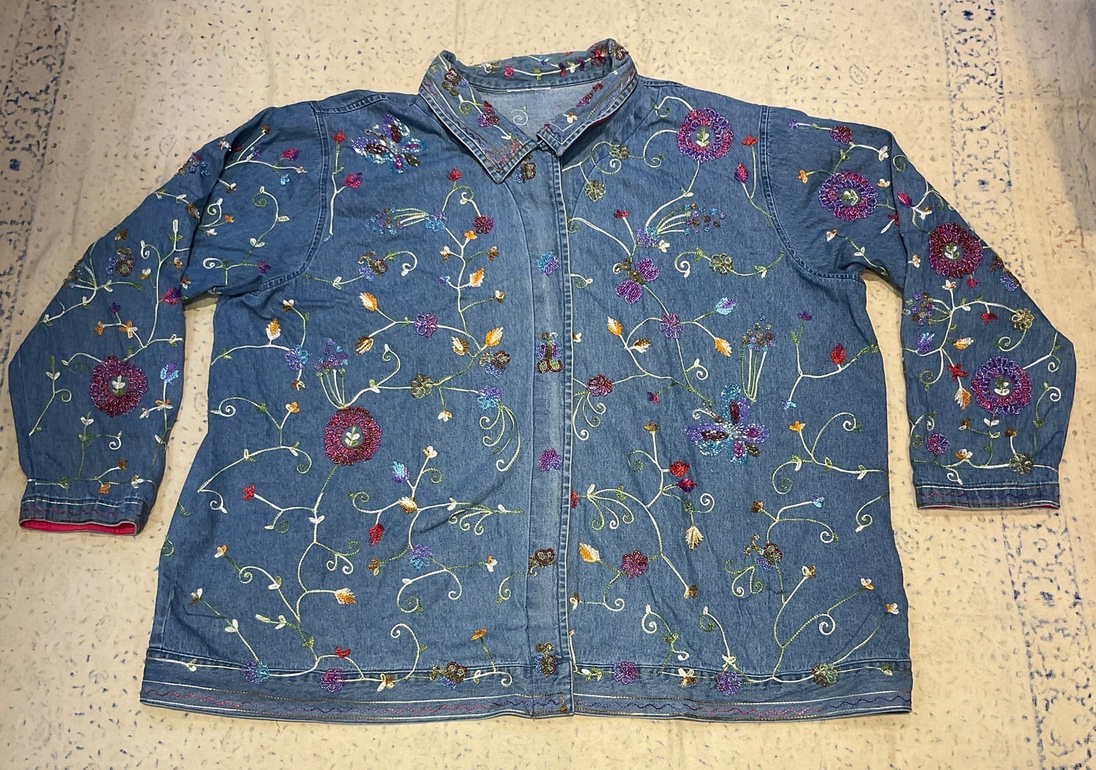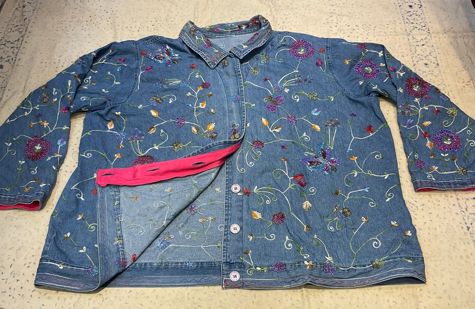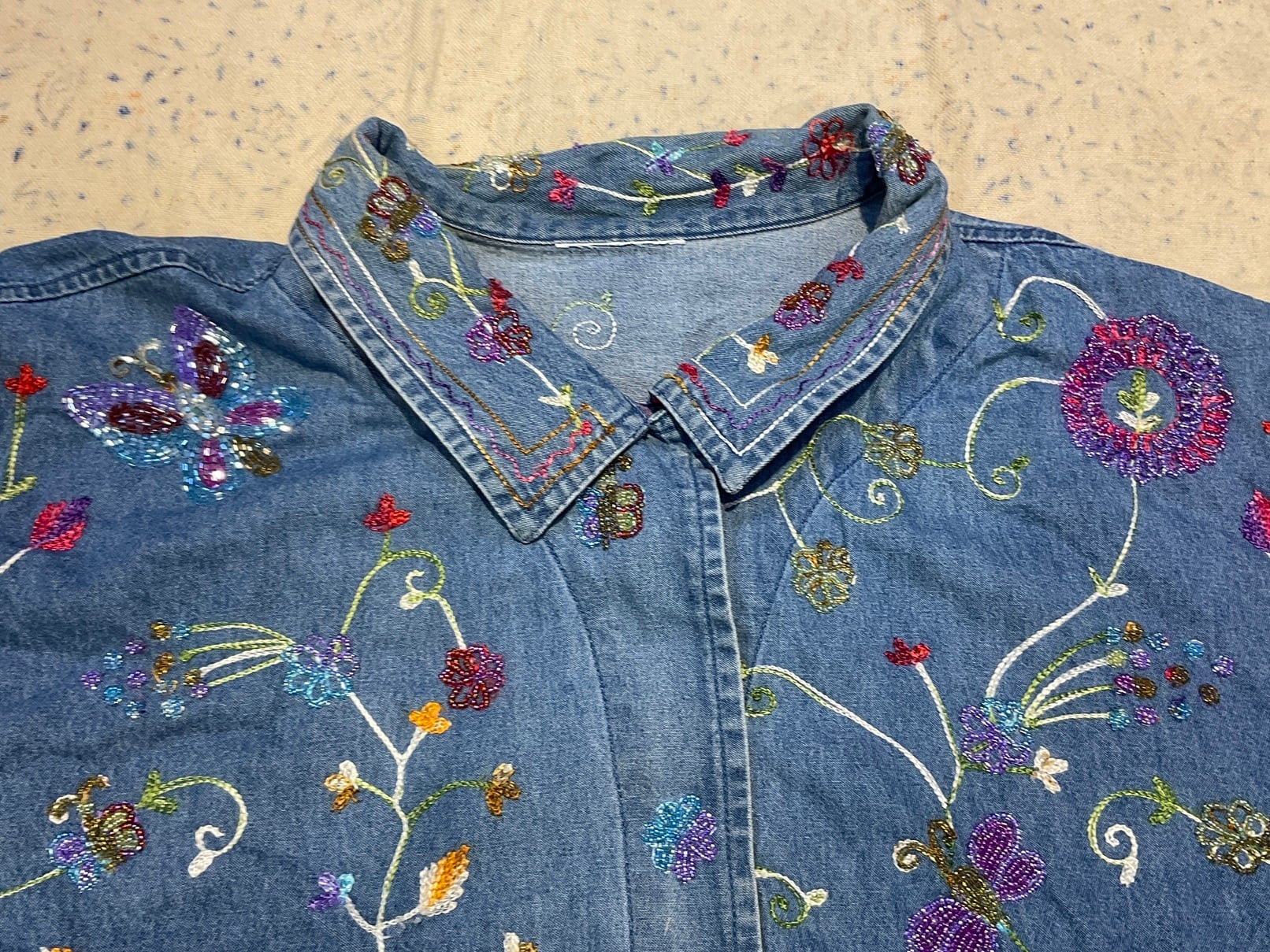 薄手のデニム生地にかわいい刺繍とビーズが施されています