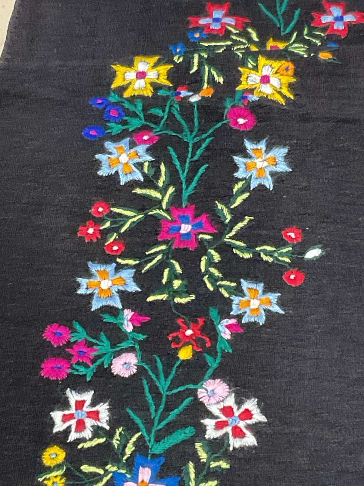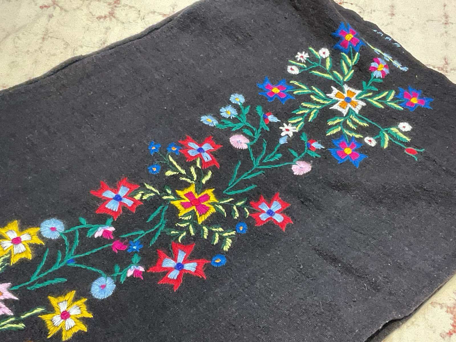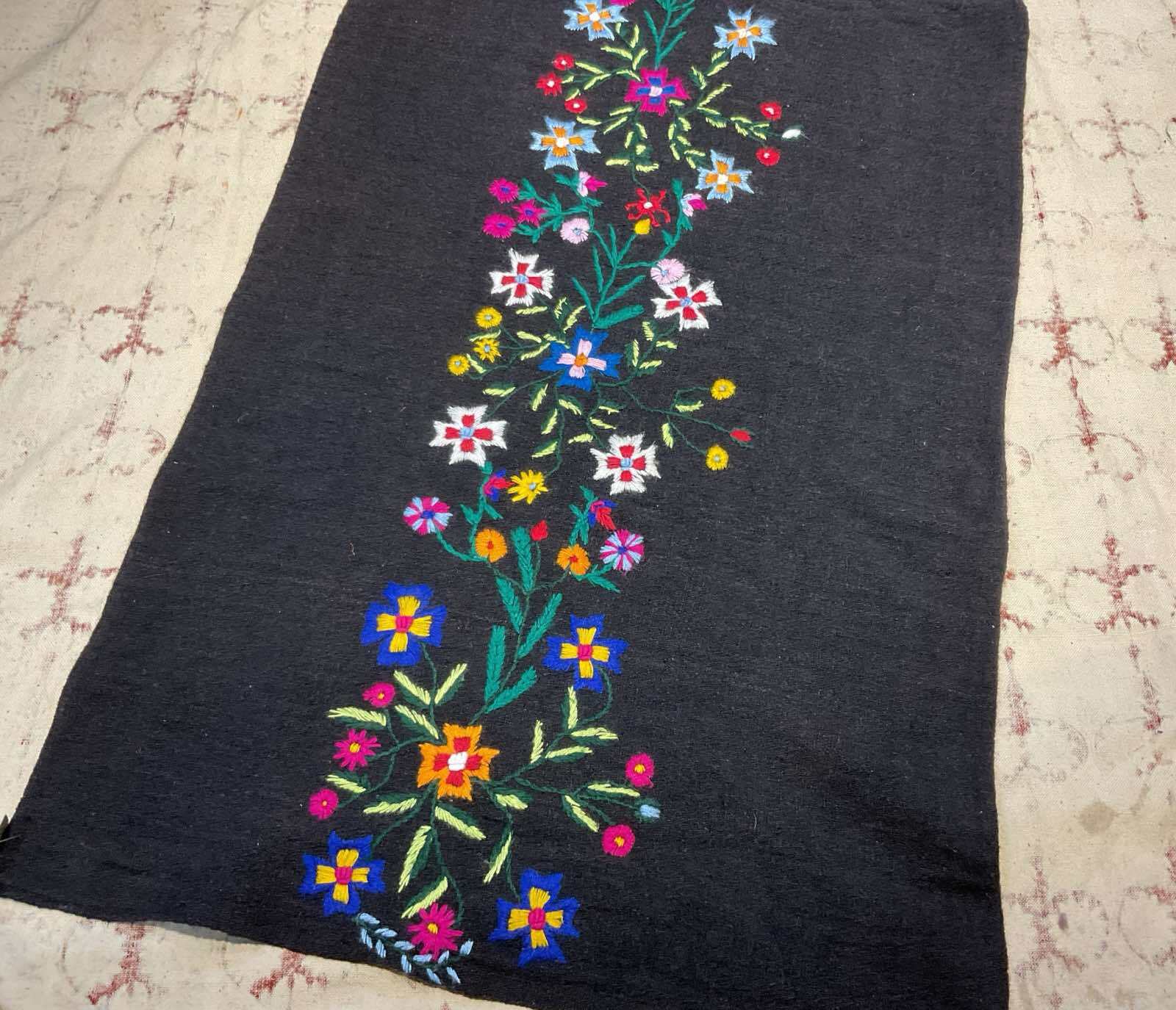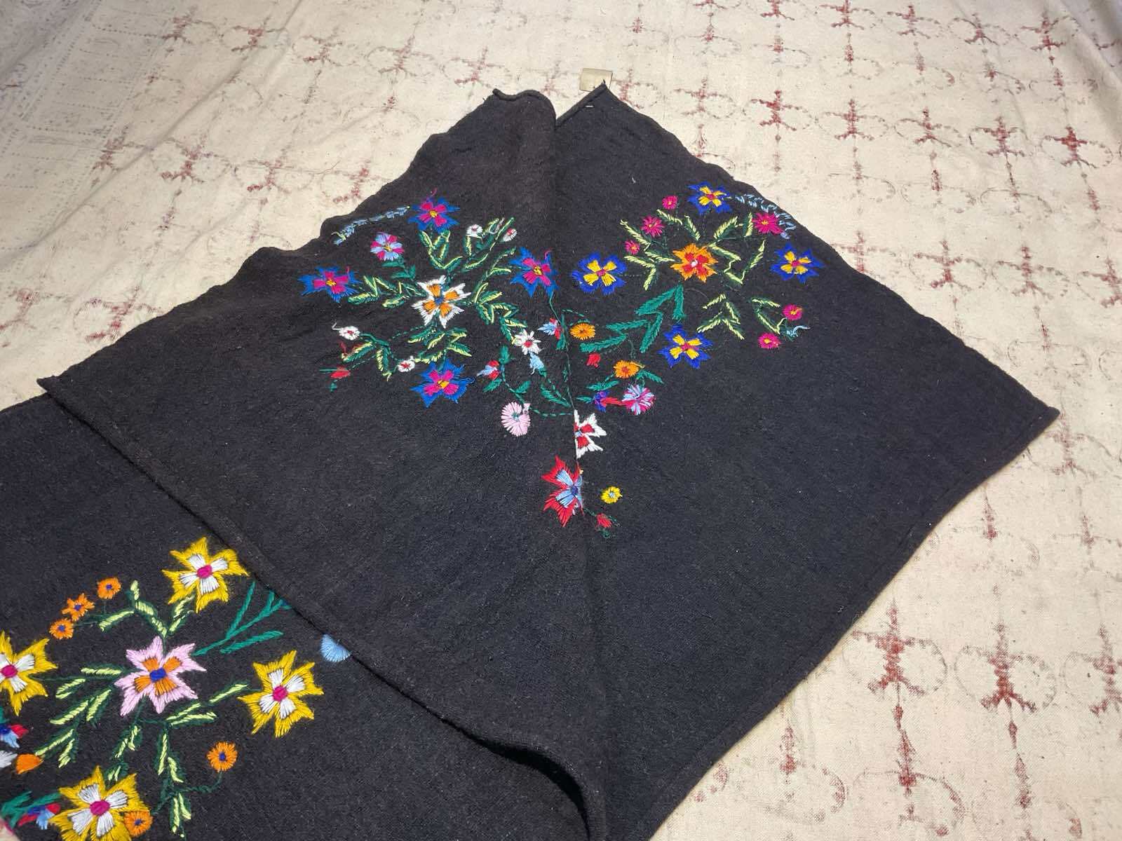 ウールの手織り生地に手刺繍されています
