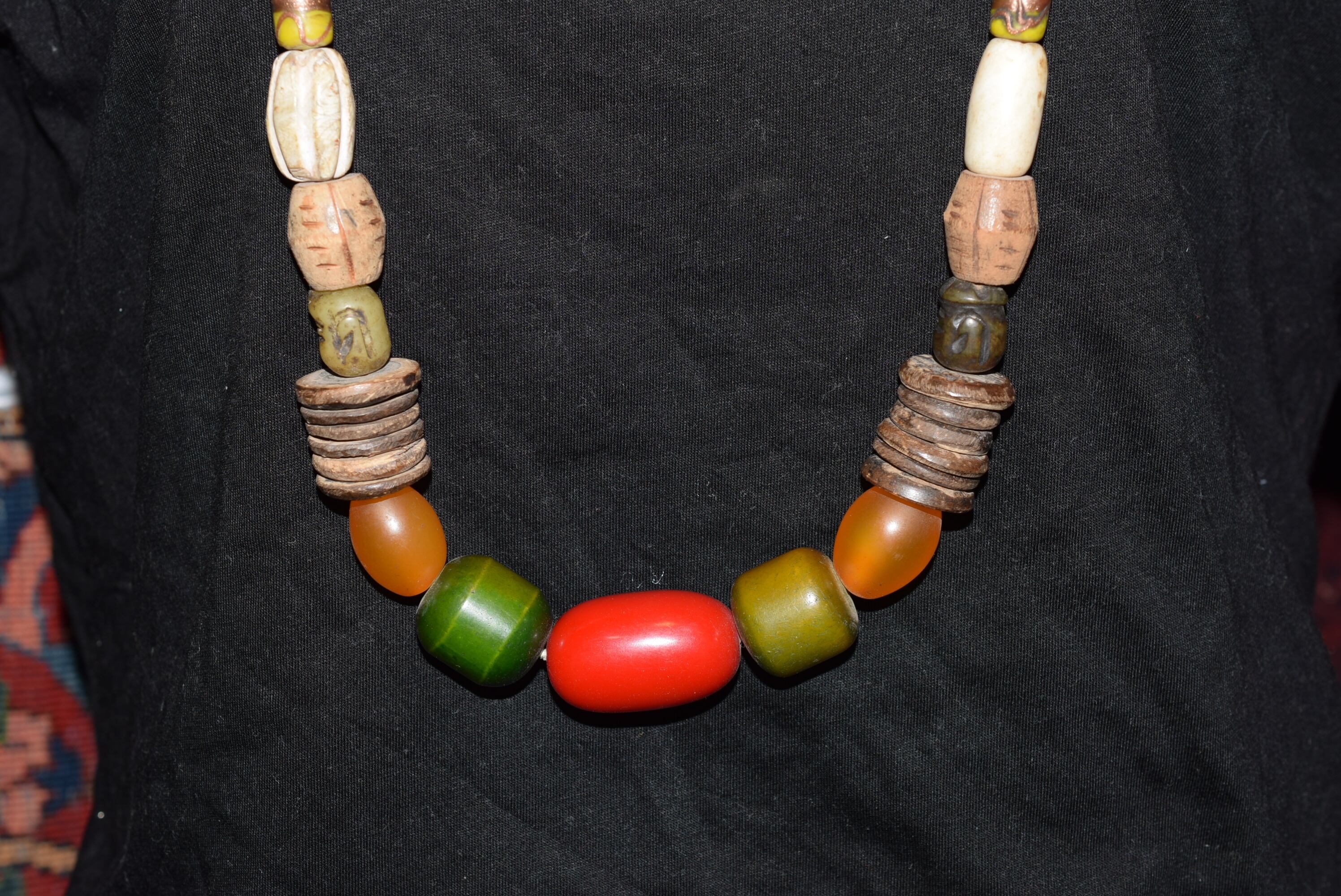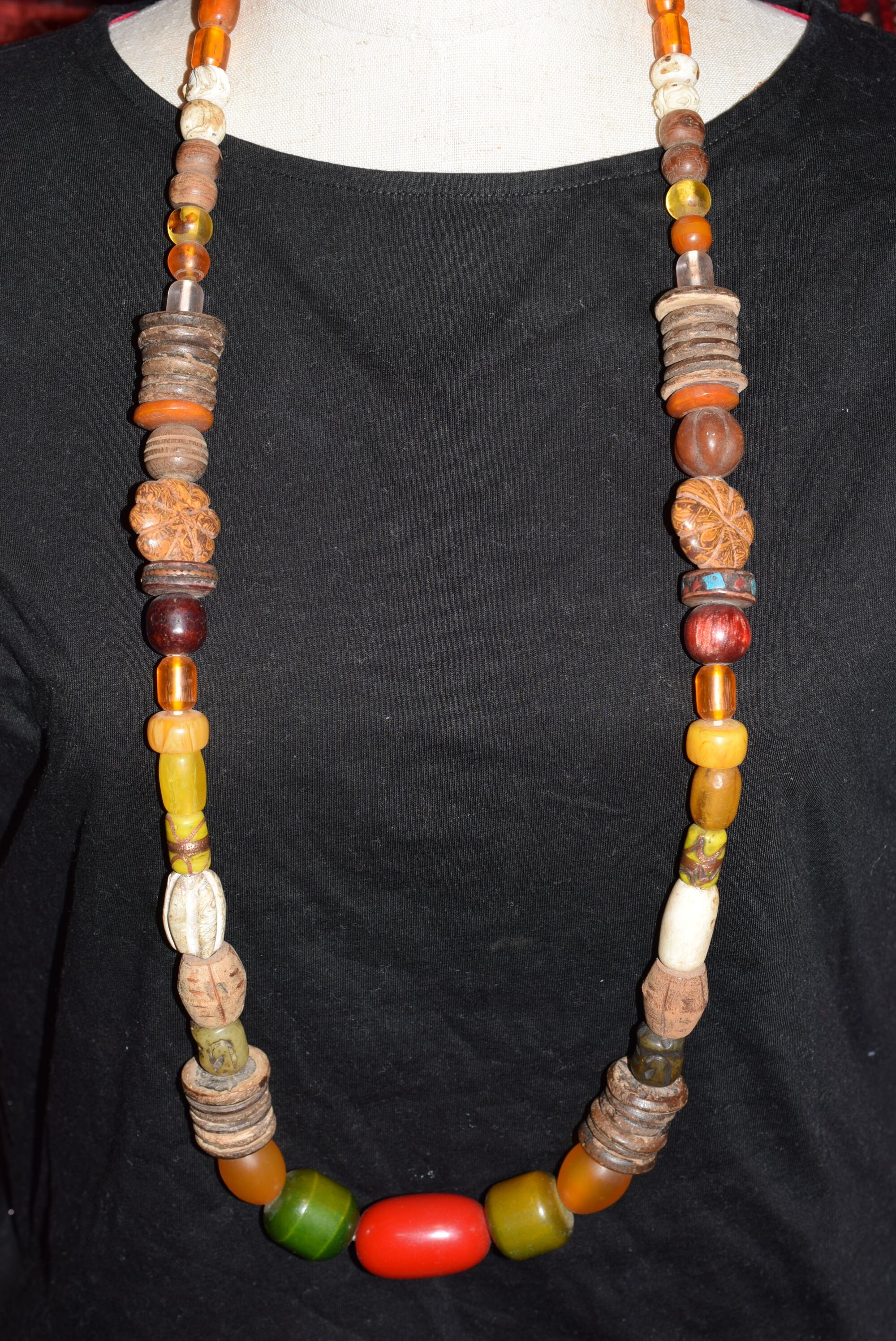 ビーズは瑪瑙、グラスビーズ、ウッドビーズ、ボーンビーズ、象嵌ビーズ、ベークライトなど様々な素材が使われています。