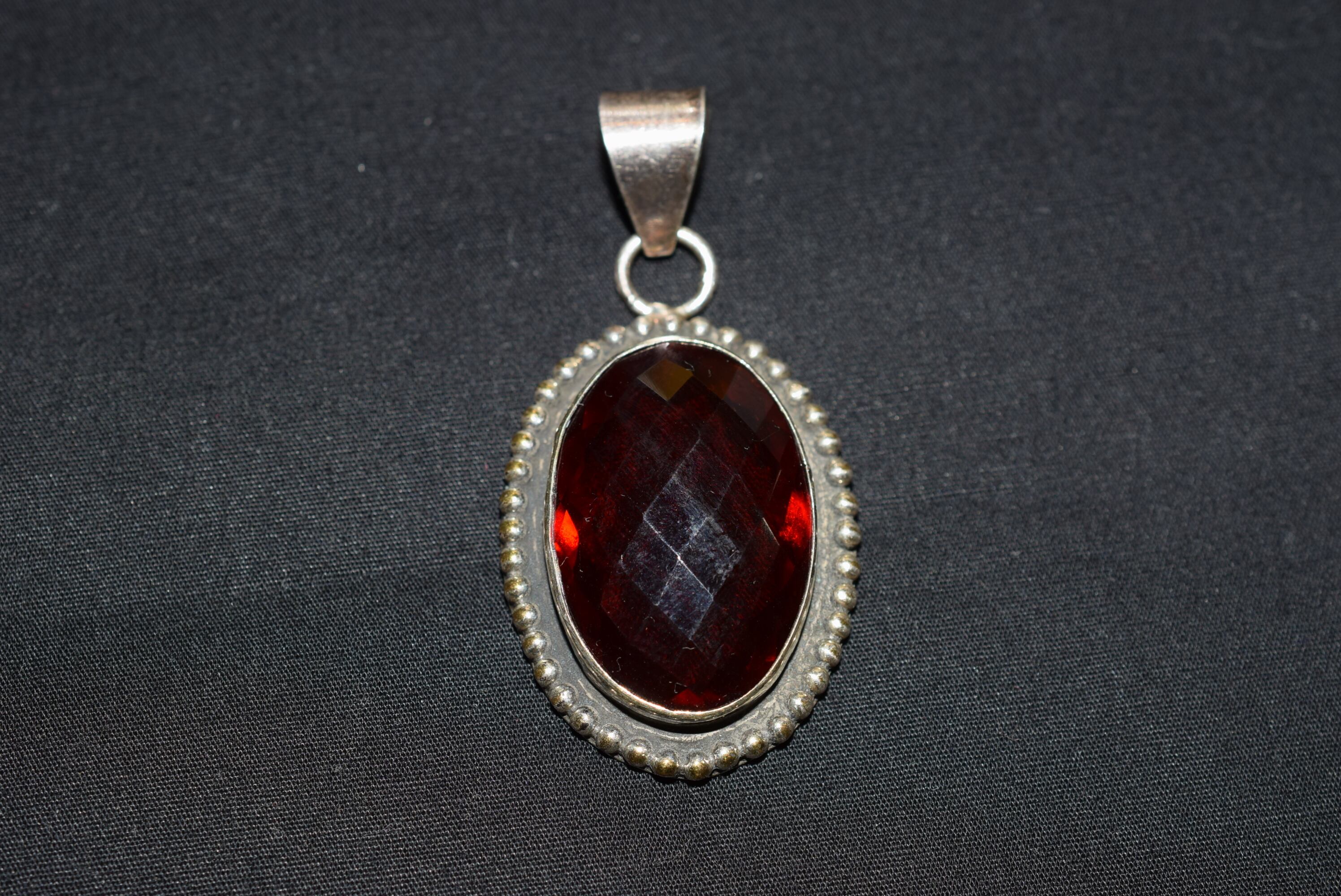 カッティングガラスの照りが美しい深い赤のペンダントです。