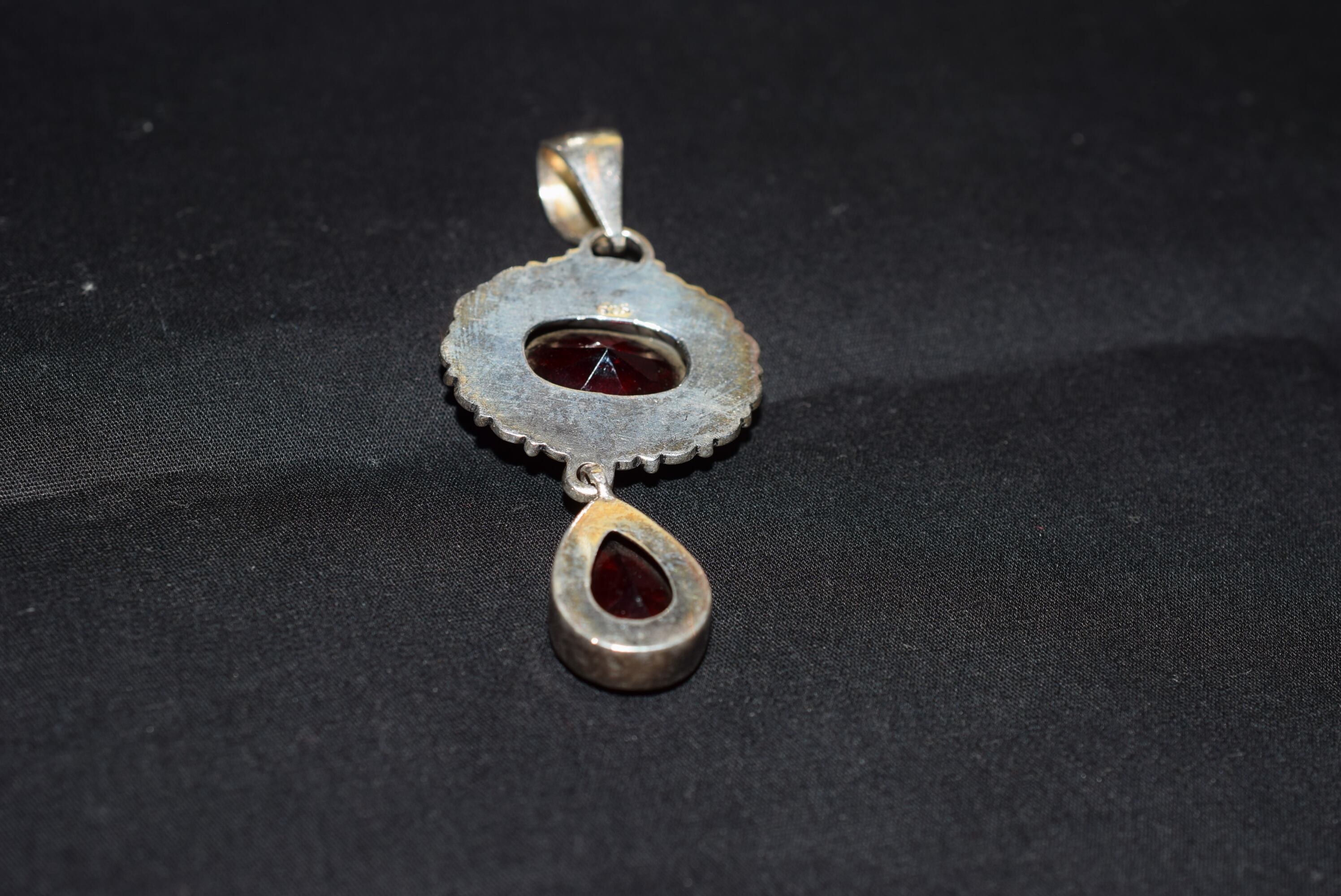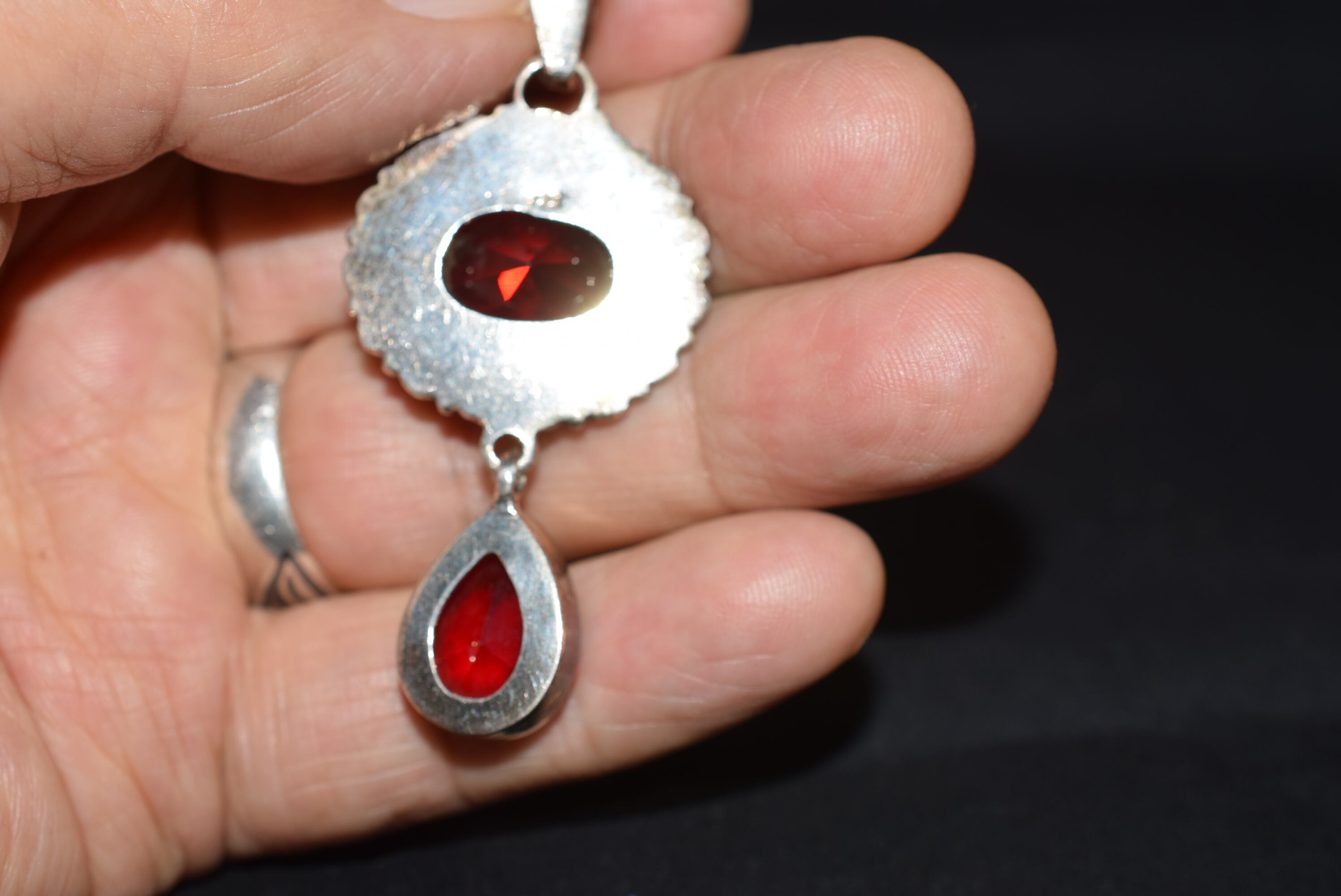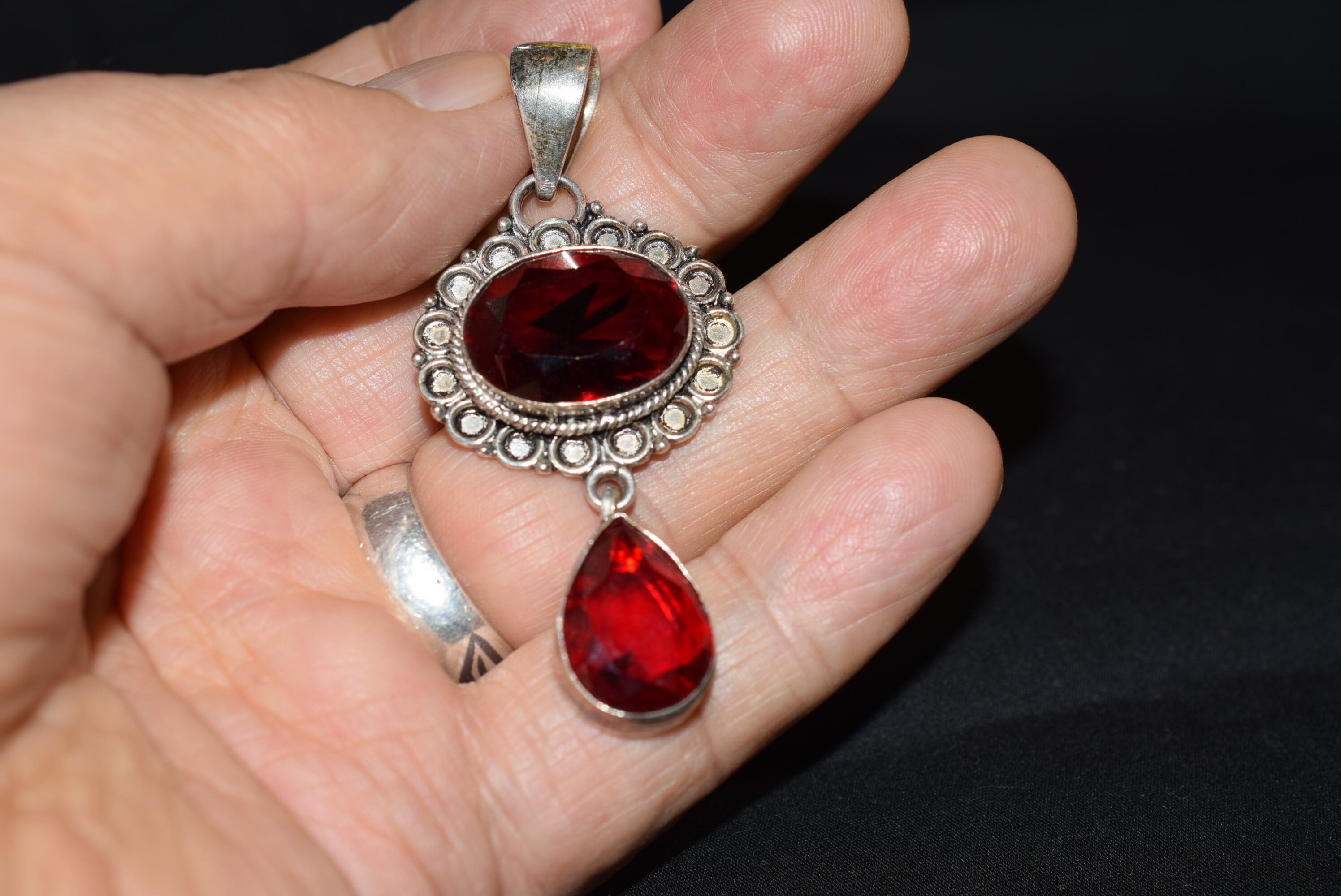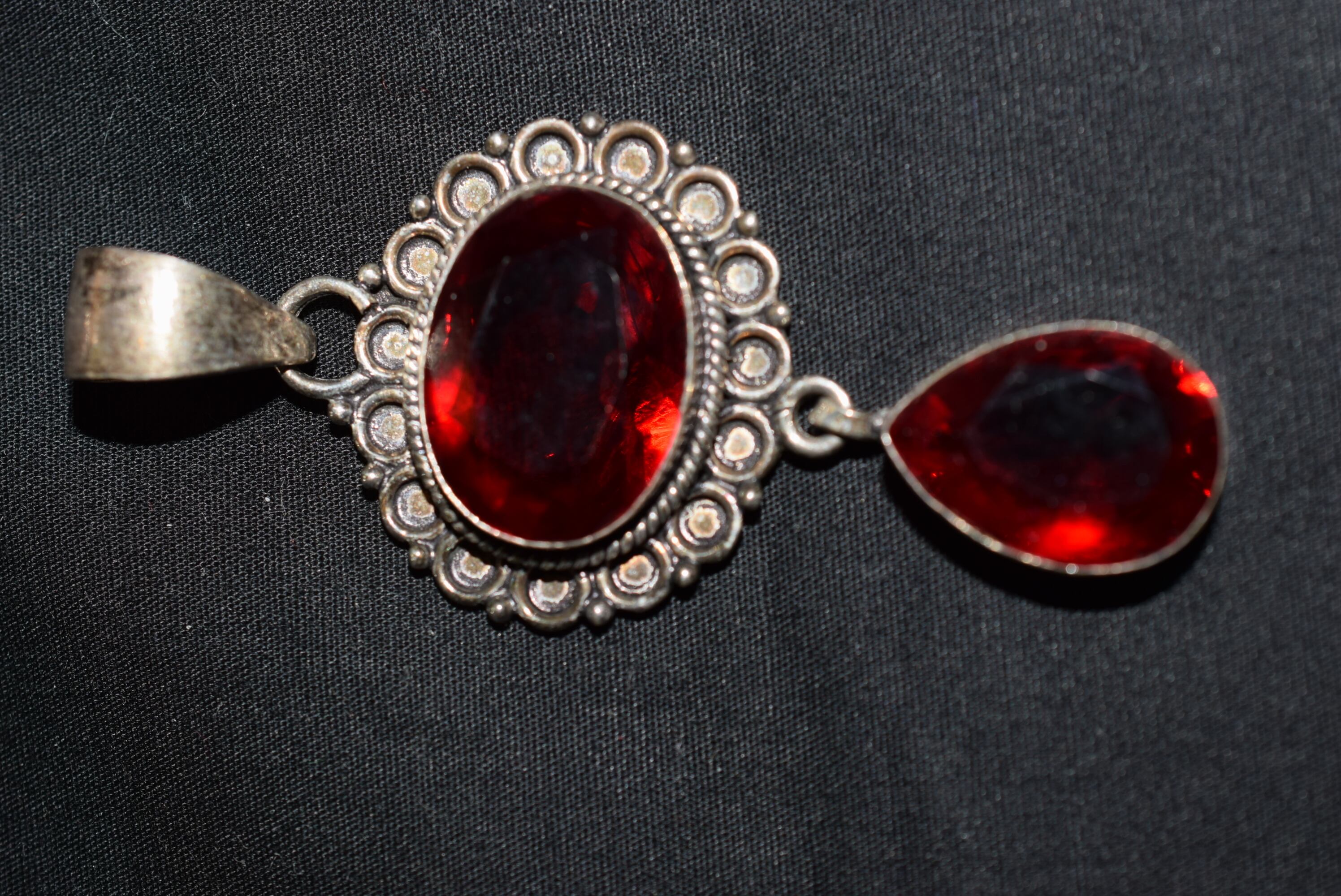 カッティングガラスの照りが美しい深い赤のペンダントです