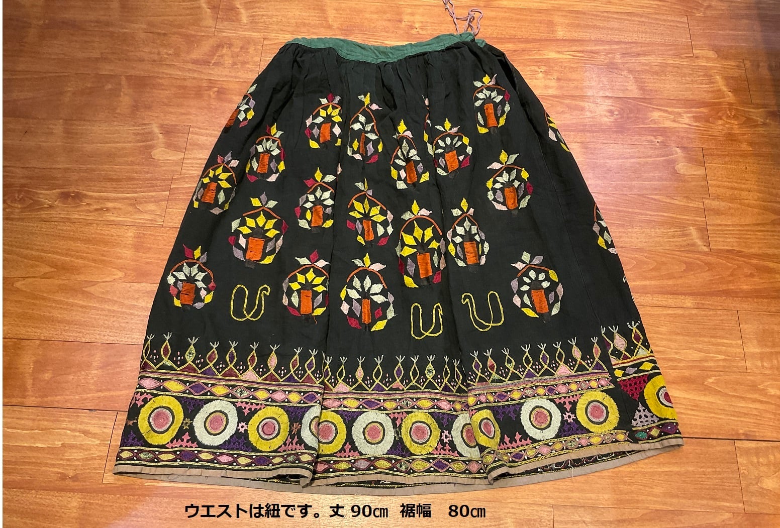ウエストは紐です。丈 80㎝ 裾幅 90㎝