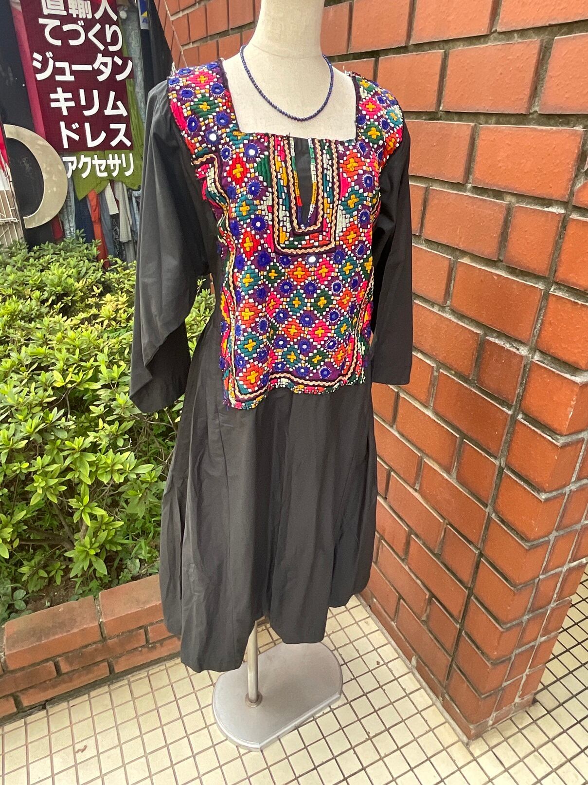 パキスタン シンド族手刺繍(ユーズド)を新しいコットン生地でリメイクしたドレスです。