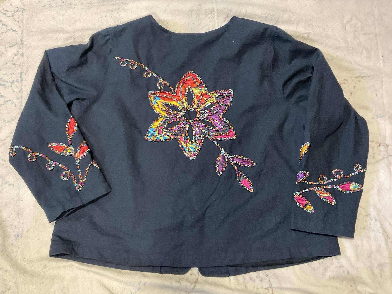 後ろ身頃の裏地に使われている生地でコードを作りそれを手で縫い付けたアップリケです。