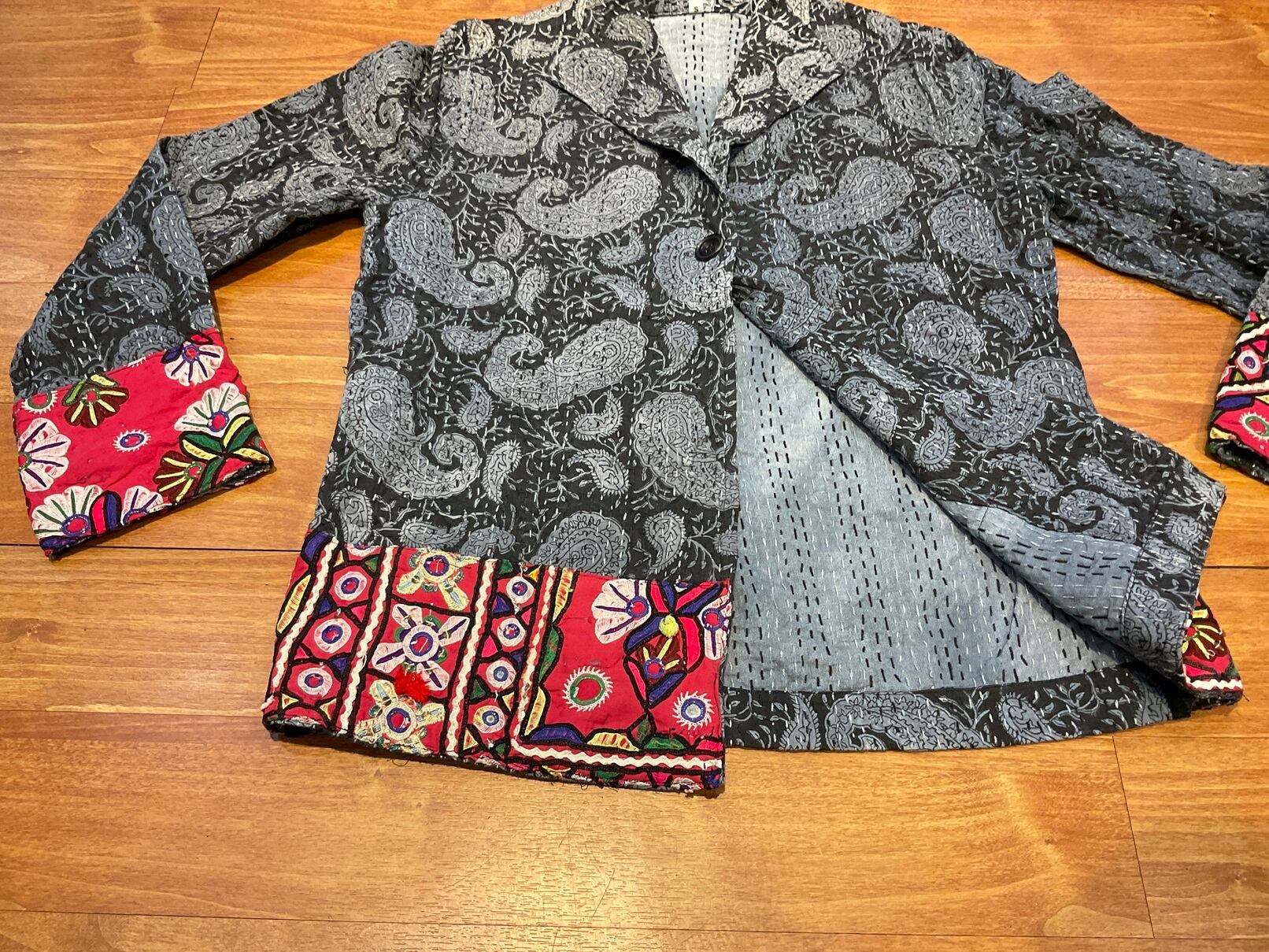 手刺しのラリーキルトにバンジャラの刺繍布がアップリケされています。