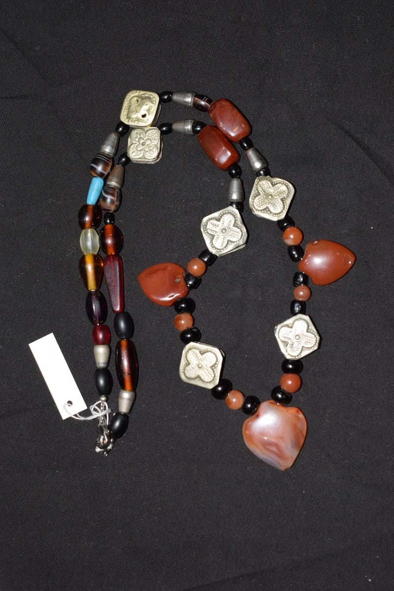 カーネリアン、トルクメンメタルビーズの他にヴィンテージガラスビーズなどが使われています。